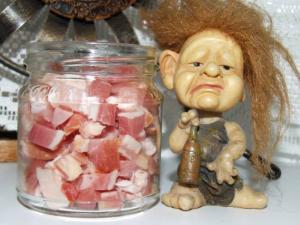 | Boczek najlepiej pokroić w kostkę (choć pewnie i plastry nieźle by się sprawdziły) i upchać w małe słoiczki np. musztardówki (ilość słoiczków zależy od ilości posiadanego boczku) ale nie na siłę żeby nie zrobić z tego mamałygi: ) Na wierzch do każdego słoiczka włożyć odrobinę smalcu (pół łyżeczki wystarczy) i zamknąć słoiki (mój sposób od lat to kropelka spirytusu kapnięta na zakrętkę... . oczywiście od wewnętrznej strony, podpalam to i wtedy taką płonącą szybko zakręcam). Najczęściej słychać wtedy charakterystyczny "klik" gdy wieczko zakrętki zostaje wessane/zassane. Powyższe słoiczki wekowałam jeden raz - 30 minut (wybór wekowania zależy od upodobania, można na sucho w piekarniku lub tradycyjnie w garnku) A potem taki boczuś wykorzystujemy na parkingu na wiele sposobów. Może być podsmażony z cebulką, może być dodatkiem/wkładką do zup, do fasolki po bretońsku, do jajecznicy i pewnie jeszcze do wielu innych dań. | |